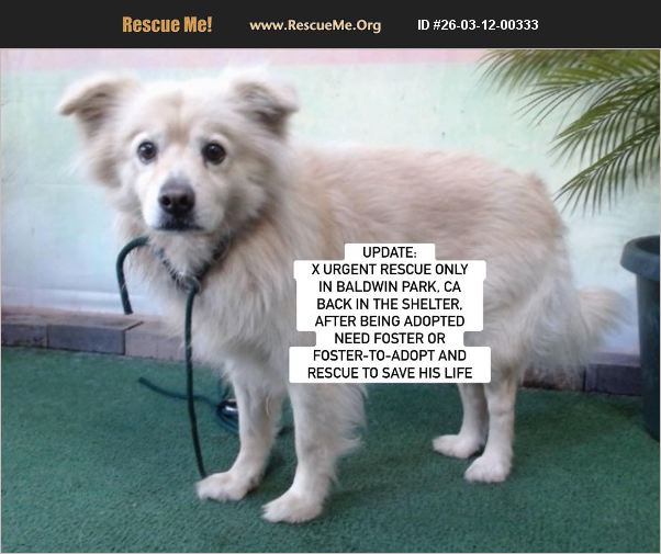 Courtesy Posting: UPDATE: X URGENT RESCUE ONLY IN BALDWIN PARK, CA BACK IN THE SHELTER, AFTER BEING ADOPTED NEED FOSTER OR FOSTER-to-ADOPT & REDCUE TO SAVE HIS LIFE! https://animalcare.lacounty.gov/dacc-details/... URGENT AT BALDWIN PARK, CA (SO CAL) ID #A5732903 LOS ANGELES COUNTY ANIMAL SERVICES- 'LAZY' MAY BE ADOPTABLE AFTER NEUTER, BUT MAY also NEED FOSTER & RESCUE NOW- ONLY 29 LBS AND SWEET, shy SENIOR BOY LISTED AS A 9 YR MALE CHOW X, BUT MAY BE AN ESKIE X- looking for a LOVING, FOREVER HOME, FOSTER, FOSTER TO ADOPT AND OR A RESCUE TO SAVE Him- Please contact Robin with questions or interest, as shared posts and comments may not been seen. We are in urgent need of finding a patient and caring home, or foster and rescue, for this adorable, smaller spitz mix. Lazy was sadly surrendered to the Baldwin Park high kill shelter and reported to be a 9 year old chow mix, although we believe he is more likely an eskie or other spitz breed mix given his smaller size, white color, and pink tongue. We were told his owners alleged he suddenly had some food aggression and bit them when they pulled some cup away. The shelter has tested him and did not find any issues with food, but of course, it is recommended to take obvious precautions to avoid future problems. Here are the shelter notes that state, 'Lazy was already in the yard when the handler decided to begin the handling assessment. He was lightly restrained on leash, and presented with a bowl of food. He showed no interest in the food, and moved away from the bowl when the handler scooted the bowl closer to him. The handler used the Assess-A-Hand to offer him some of the food, but he turned away. He did not show any interest in the food, and did not react when the handler picked up the bowl.' Lazy is noted as needing more socialization, and being defensive and fearful. As this poor little older guy is not doing well in the shelter environment, he is expected to become urgent and on the euthanasia list soon. Lazy is still hidden in the back where no one sees him and before he is made adoptable, if this ever happens. If and while Rescue Only, any potential adopters will need to go through a rescue group. And most rescues will either need a foster or a foster to adopt to save him. Therefore, if you may be interested in fostering, fostering-to-adopt, or helping Lazy in some other way (ie., pledging for his rescue), please contact [email protected] or Southern California Chow Chow Rescue Network who is trying to find placement asap, and we can try to pair fosters or interested parties with a willing rescue group. Potential adopters and Rescue groups may contact the shelter directly at [email protected] and by calling: 626-962-3577 or 626-430-2378 and providing his ID. We will be posting any additional pictures, videos and updates on his facebook post at: https://m.facebook.com/story.php?story_fbid=10168662690788125&id=783968124&mibextid=wwXIfr Note: to view contents of links you will need to copy and paste them separately into your browser.