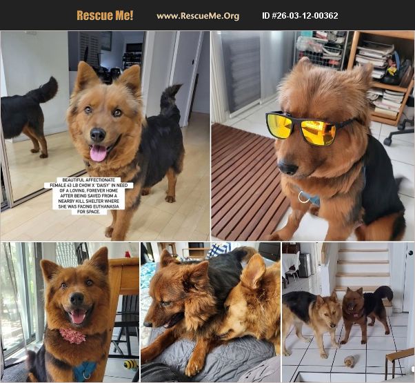 Courtesy Posting: ORANGE COUNTY, CALIFORNIA- BEAUTIFUL AFFECTIONATE FEMALE 43 LB CHOW X 'DAISY' IN NEED OF A LOVING, FOREVER HOME AFTER BEING SAVED FROM A NEARBY KILL SHELTER WHERE SHE WAS FACING EUTHANASIA for space. Please help us find a loving, forever home for this petite girl fondly named Daisy who is perfectly sized and has a beautiful deep red coat with an amazing black shawl. Estimated to be near 4 years old now, Daisy was saved from a S Cal high kill shelter by a Good Samaritan who offered to foster her to save her life. The foster was then paired by shelter networkers with an out of state rescue, but this supposed rescue sadly later disappeared, leaving the foster and Daisy stranded. We are therefore trying to help in this dire situation as the foster has other dogs she is caring for, and is unable to foster and save others until we can find Daisy the wonderful home she deserves. This good Samaritan foster has also taken over her care and ownership, and kindly paid for Daisy to be vetted and spayed, and has many great things to say about her: 'She is good with people and other dogs and best to introduce her to a new dog slowly beginning with a dog who is calm and submissive. She is very calm and quiet. Not a barker. She currently cohabitates with a 50-pound pitbull mix and two other dogs, one 65 and and one 80 pound both chow chow German shepherd mixes. Daisy is fun and loves to be around people and well adjusted. I feel she would do best as an only dog so she can blossom without interference of another dog taking all the attention that she probably is craving. She is more on the timid side and is walked twice daily, current on all her shots and spayed.' Daisy's dna was also done and she is mostly chow and cattle dog. with a little shepherd sprinkled in giving her many nice qualities of each breed. Daisy has lived as an indoor dog and is Hundred percent potty trained according to her foster. She has no medical issues and her foster said she is not a biter, but mentioned she can have some alpha tendencies with other dogs like many cattle dogs do, and why they felt she would be better as an only dog. However, Daisy is friends with other dogs and we have several nice videos to share. If you are interested in meeting and adopting this sweet beauty, please contact [email protected] or Southern California Chow Chow Rescue Network who is assisting with her placement. We will be posting more pictures and videos of Daisy on facebook at: https://www.facebook.com/783968124/posts/10168663045363125/?mibextid=wwXIfr Note: to view contents of link you will need to copy and paste it into your browser.