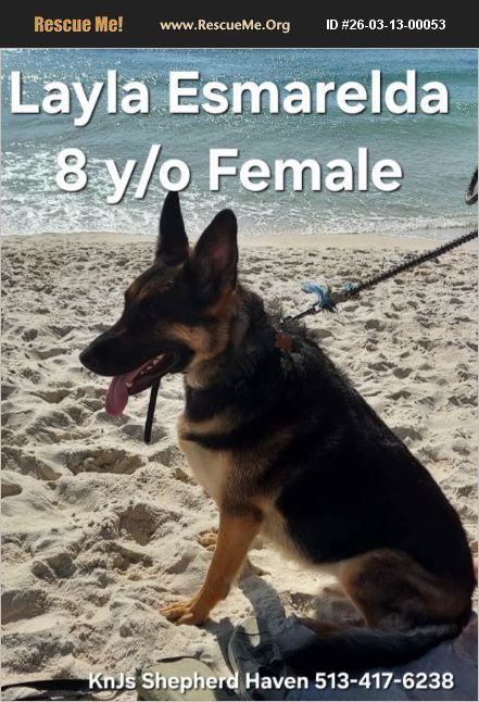 APPLY HERE: TO ADOPT, APPLY HERE: https://docs.google.com/forms/d/e/1FAIpQLSftfJ3aixd0OY8rysxPW0DL1p-swDSrE3k7E8tt_pu7dM2xHQ/viewform?usp=header�%81%A0 CONTACT ME: 513-417-6238 or EMAIL: [email protected] ***Trying to keep this amazing breed OUT of shelters, so please HELP me by SHARING this post and/or sending to anyone that may be interested in adopting. IT TAKES A VILLAGE, AND YOU ARE MINE. Those of you that rescue/adopt these Shepherds in need instead of paying a Breeder, YOU are the REAL TRUE HEROES.***Thank you so much. [I do my best to be as accurate as I possibly can in these profiles. I disclose all that is disclosed to me]. [Case opened on 03/13/26]. URGENT!!! Cincinnati, Ohio. (willing to drive up to 4 hours). 8 Y/O FEMALE GSD (DOB: 01/16/18). Her name is 'Layla Esmeralda'. Background: Layla has been with her current Shepherd parent since she was weaned as a puppy. She is a full blood AKC registered German Shepherd who has been deeply loved and trained throughout her life. UTD on shots WITH record. Fixed. Good with kids. Good with dogs. Good with cats. House trained. NOT Crate trained (she free-roams the home when left alone and does very well). Any known medical issues?: None known. Abuse/Neglect/Trauma History?: None. ENERGY LEVEL: Low. PREY DRIVE LEVEL: Low. Weighs 100 lbs. Currently on food (not specified). Good with car rides?: Yes. Socialized with: *people?: Yes. *dogs?: Yes. Good with meeting new people? (ALWAYS USE PROPER INTRODUCTION!): Yes. Loves: Chilling on the couch, lacrosse balls, Nylabones, butt scratches, sleeping under your side of the bed, walks, playing with kids and dogs, balls, fetch, being near her person, treats, and human interaction. *Intelligent and knows Basic Commands?: This breed is super intelligent. Layla has advanced behavioral training and beginner search and rescue training. *Good Recall? (ALWAYS RETRAIN BEFORE ALLOWING OFF LEASH): Yes. *Good on a Leash?: Yes. *Lovable?: This breed is super lovable once they claim you as their person/family. *Eager and fast learner?: This breed is super fast learners when they are being committed to and worked with. Bite History?: None known. NOTES FROM CURRENT SHEPHERD PARENT: 'She is the most wonderful dog and will be a gift for the right family.' Re Homing because�'�|: The current Shepherd parent is unfortunately facing homelessness due to divorce and wants to ensure Layla is safe, cared for, and placed with a loving family who will cherish her. Layla will be a great companion for the right person. Additional notes: Layla does experience fear of storms and fireworks. Her current Shepherd parent has given her Trazodone when needed during those situations. Layla absolutely loves human interaction and will happily sit beside you while you talk - almost like she is listening to every word. Will thrive best�'�|?: In a loving home where she can spend time with her people, enjoy a calm environment, and continue to be the loyal companion she has always been. Comes with: Collar, leash, harness, food, toys, and AKC papers. RehomingFee $50. If not on Facebook, please text me for more pics and full Profile Serious Inquiries, please APPLY HERE: https://docs.google.com/forms/d/e/1FAIpQLSftfJ3aixd0OY8rysxPW0DL1p-swDSrE3k7E8tt_pu7dM2xHQ/viewform?usp=header�%81%A0 Thank you. Would you like to donate to a great cause? Any help is so much APPRECIATED and NEEDED. (We are NOT 501c) Help US to help THEM. Tysm #ItTakesAVillage LINKS TO DONATE: Amazon WishList: https://www.amazon.com/hz/wishlist/ls/1D1I1QOVAGR4H?ref_=wl_share�%81%A0 Walmart WishList: https://www.walmart.com/lists/shared/WL/6214b31a-4919-4d0a-868e-b75e6bace5e0�%81%A0 Venmo: https://venmo.com/code?user_id=2889571939385344656&created=1767974792�%81%A0 CashApp: https://cash.app/$KnJsShepherdHaven�%81%A0 PayPal: Keren Lainhart [email protected] 513-417-6238 KnJs Shepherd Haven 513-417-6238 [email protected] Text/Call: 513-417-6238. Please JOIN OUR GROUP: Go to the ALBUM 'Current Shepherds Needing Rehomed' and it will show all of the Shepherds that we are trying to find great homes for. Please message me if you are interested in any of them. Thank you https://www.facebook.com/groups/593859788742255/?ref=share�%81%A0