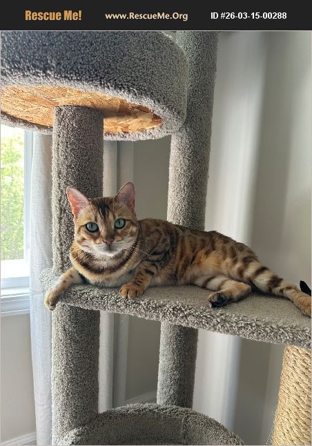 Stella is a six year old female bengal cat. She is declawed in the front and she is only up to date on her rabies vaccine. She is good with adults and other cats and dogs but not good with small kids. Looking to rehome her because we now have small kids.