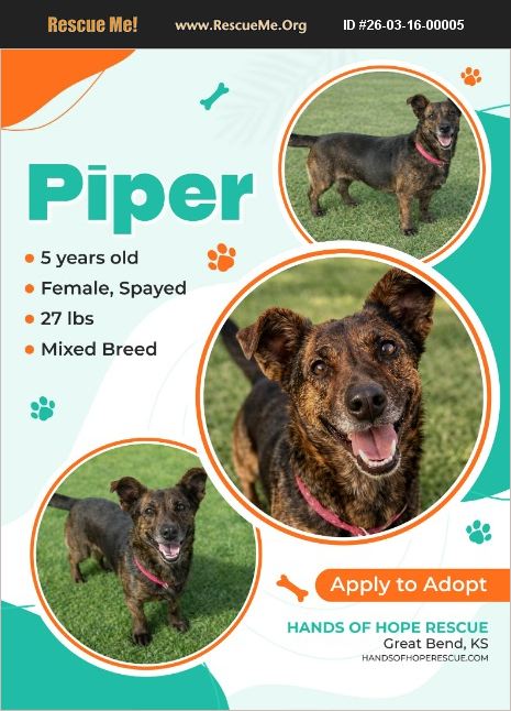 Meet the absolutely adorable Piper! This little girl is a sweetheart with a unique shape of a longer body and shorter legs, or known as a 'low rider!' Piper is about 4 to 5 years old and a mixed breed of sorts. Possibly beagle or basset or dachshund with a smaller shepherd type??? We have no idea but she is the cutest and the SMARTEST! This girl already knew commands and was housetrained on arrival! Her unique shape and size make her a natural conversation starter wherever she goes! Being medium sized, she is big enough to play and explore, but small enough to cuddle right up next to you. Piper has a calm and gentle nature and gets along wonderfully with dogs, cats and kids!! She is not a barker which makes for a more peaceful companion. Piper is spayed, current on vaccinations, microchipped, heartworm tested and on monthly preventatives. If you think this sweet girl would fit into your family fill out an application on our website at www.handsofhoperescue.com.