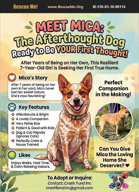 Mica is a delightful 'mini' Australian Cattledog. She is calm for the breed. Smart, attentive, basic obedience trained, and learns quickly. Her foster family has had no difficulties with her at all. Despite not being loved in her original home (7 yrs), she has tons of love to give. Will travel to any part of CA, OR and NV for the right home.