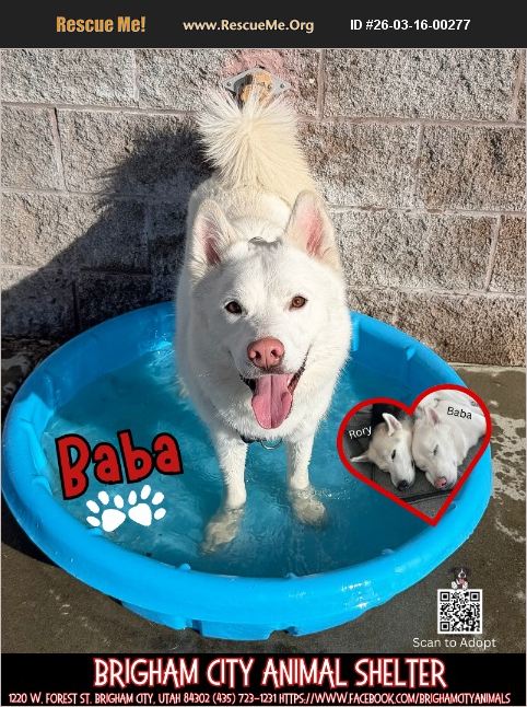 If you love Huskies, Baba might be your kind of adventure buddy, especially if there's water involved! Meet Baba! Hi! I'm Baba, an almost 4-year-old Husky boy (DOB 5/14/22) with a sweet personality and a playful side. I'm a neutered male and my adoption fee is $40. I came to the shelter with my friend Rory, and we get along great. We love playing together and hanging out in the yard. We could absolutely go to a home together, but the shelter understands that adopting two Huskies can be a big commitment, so we are also available to go to separate homes if the right families come along. One thing everyone here knows about me�'�| I LOVE the shelter pool! Splashing around and cooling off is one of my favorite things to do. A little about me: Neutered male Husky Adoption fee $40 Needs vaccines Very sweet and playful Enjoys the play yard and water time Said to do well with other dogs when properly introduced Never been around cats Like most Huskies, I'm smart, energetic, and sometimes a little mischievous. I will need a secure yard, because my breed is known for being talented escape artists. If you're looking for a fun, loving Husky who enjoys playtime and splashing in the pool, I might be your guy. Please share Baba to help him find a home. Adoptions are upon approval of an adoption application Shelter Hours: Monday - Thursday 12-6 pm Brigham City Animal Shelter 1220 W Forest St, Brigham City, UT 84302 (435) 723-1231 Facebook Page: https://www.facebook.com/brighamcityanimals Online Application: https://forms.gle/RquyC9aWssWYamX46