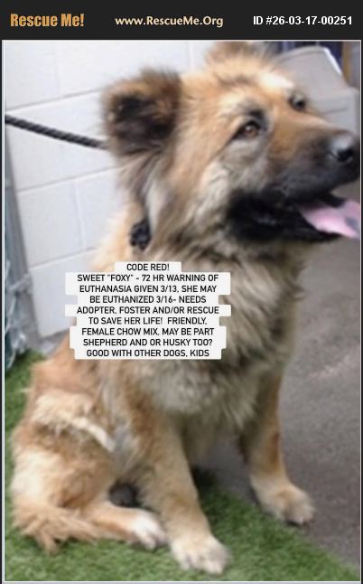 Courtesy Posting: CODE RED - DOWNEY SHELTER (LA COUNTY) in S CAL- SWEET 'FOXY' ID #A5759080- 72 hr warning of EUTHANASIA given 3/13, she may be EUTHANIZED 3/16- needs ADOPTER, FOSTER AND OR RESCUE TO SAVE HER LIFE! Friendly, Female chow mix, may be part shepherd and or husky too? Good with other dogs, kids Listed as a 5 year old chow mix, the shelter says 'Roxy is a sweet girl who's looking for a second chance at a loving home She was surrendered when her previous owner had to move and couldn't take her along.' Her prior owner said ' she is a good loveable dog' and provided wonderful details about her such as she lived with and or was around with large and small dogs and even cats, interacted with kids and is playful, never bit anyone, is quiet, and good in a car. When Roxy first arrived at the shelter, though, she was understandably very nervous and hesitant to approach, but she's slowly learning that people can be kind. She now allows gentle touch and is beginning to relax. Her medical notes state, 'Appears friendly, approached kennel with a loose body and soft wagging tail, giving kisses through the kennel door, readily ate treats when offered, seeks out affection'. However, following her spay on 3/10, she was noted as having some nasal discharge on 3/13 and is being treated for kennel cough, as well as being monitored for some tummy troubles. Despite everything she's been through, this brave girl deserves a safe, patient, and loving home where she can finally feel secure and truly thrive'. It should be noted Foxy came in with an embedded collar that has been removed, lived mostly outdoors, but is said to be crate trained. Her weight has dropped to 54 lbs from 61 lbs likely from stress of being abandoned, as the owner had her since a puppy. She has been placed on medication for both issues. She started on doxy on 3/13, but this caused her to be added to the very urgent list, soon to be euthanized. We have a copy of the owner surrender notes, as well as medical and behavior notes that state, 'She allowed the handler to pet her whole body with no issues. She was nervous and jumpy, but was easy to handle. When the assessment was over, she walked nicely back to the kennel.' Full notes can be found at: https://trello.com/c/tQpwBKcY ROXY IS APPROVED FOR PUBLIC ADOPTION, AND QUESTIONS CAN BE ANSWERED 24/7 AT (562) 940-6898- but please call asap as she is almost on her final day IF YOU ARE A RESCUE: PLEASE EMAIL DOWNEY ANIMAL CARE CENTER STAFF at [email protected] and provide her ID and 'do not euth' on subject line. Please also call. However, as most rescues need a foster- so if you can foster or need further help, please contact [email protected] asap at Southern California Chow Chow Rescue Network who will try to pair you with a rescue and or obtain further info. We can get you further notes at: https://trello.com/c/tQpwBKcY We also will be posting updates, and any additional pictures and video as we receive such on Facebook: https://m.facebook.com/story.php?story_fbid=10168673238483125&id=783968124&mibextid=wwXIfr Her listing link is: https://24Petconnect.com/DetailsMain/LACO/A5759080 To view contents of links you will need to copy and paste each one separately into your browser.