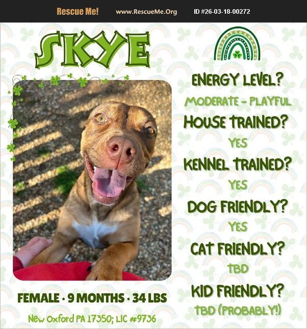 Dog is coming soon. More information and area fostered will be posted once they are available. All dogs are kept up to date on vaccines and preventatives while in foster care. New Oxford PA 17350; LIC #9736�'�� We are PA Caring for K-9's, an all-breed dog rescue that is solely run by volunteers. Most of our dogs are rescued from high kill shelters in the South. If the dog is posted, they are still available! Once arriving, these dogs enter foster homes, as we do not have a shelter. We cannot adopt out dogs to a home with dogs that are not fixed or up to date on shots. If interested in adopting, please submit an application online at www.pack9rescue.org. Our adoption fee for altered dogs is $350 and goes directly to saving the lives of more dogs. Our adoption fee for unaltered puppies will be $400 which includes a refundable $50 deposit upon receipt of spay/neuter certificate. Learn more about adopting from us or volunteering for us at www.pack9rescue.org or check us out on Facebook for more information and a complete list of dogs available for adoption. https://www.facebook.com/PaCaringForK9s/ See upcoming events below where PA Caring for K9's will be with some of our adoptable dogs! Saturday, March 28, 2026 10am-1pm Ciocca Subaru of York (1202 Loucks Rd York, PA) Saturday, April 18, 2026 10am-1pm Ciocca Honda of Harrisburg (8001 Allentown Blvd Harrisburg, PA) Saturday, May 16, 2026 10am-1pm Tractor Supply Co. Harrisburg (7150 Allentown Blvd Harrisburg, PA) Please check our Facebook page closer to each event as we will update daily with dogs who will be attending. All are invited to meet our dogs, but only pre-approved adopters with all household humans and dogs present will be able to adopt at the event. Apply today at https://www.pack9rescue.org/applications/ to become pre-approved.