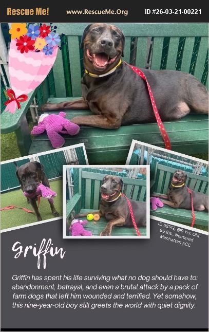 This post is going out with a prayer for poor Griffin , he is cat friendly !!! DUMPED BACK AT THE SHELTER WITHOUT TELLING RESCUE !! How many times can a heart be broken before it stops hoping? GRIFFIN needs a foster or adopter Griffin is back at the shelter, and we are completely heartbroken. This was not a proper return and no one contacted us. We found out the same way strangers do, by seeing his face back behind kennel bars, and trying to process how this could have happened again. People are so cruel and now his life is on the line . Griffin was there as a young pup, adopted for 5 years before he was there again last year, and now at 8 years old, he is back for the third time. Three times abandoned, three times left behind, and three times he has had to watch the people he loved walk away. And somehow, despite all of it, he still smiles. It is the same soft, gentle smile that once made us believe his happy ending had finally come, the same smile that quietly asks if he is still a good boy even after everything he has been through. Griffin is not the problem and he never has been. He is the same dog we told you about, calm, loving, and deeply loyal. He is a 76 pound cuddlebug who just wants to rest his head next to someone who will not disappear. He is well mannered in the home. He knows his commands, he takes treats gently, and he carries his stuffed toys like they are the only things he has ever truly been allowed to keep, his treasures. He does not understand why he keeps losing everything, but we do, and it is breaking us. This time feels different in the most frightening way. An 8 year old dog back in the shelter for the third time is how dogs get overlooked, how they run out of time. Griffin deserves one person who truly means forever, someone patient and kind who will see him not as a returned dog, but as a good, gentle soul who has never once given up on people. He is still waiting, still hoping, and still smiling. Please do not let this be how his story ends - we need to get him out of the shelter ASAP. 8 years old, 76 lbs, gets along with cats, but should not live with other dogs due to his past trauma. In the past a pack of dogs attacked him . This boy really does deserves the very best after all he went through. Can call Kat 516 457-3678 and will share with you more pictures or call 917-689-8414 | [email protected] Apply to foster or adopt Griffin at AmsterDog.org