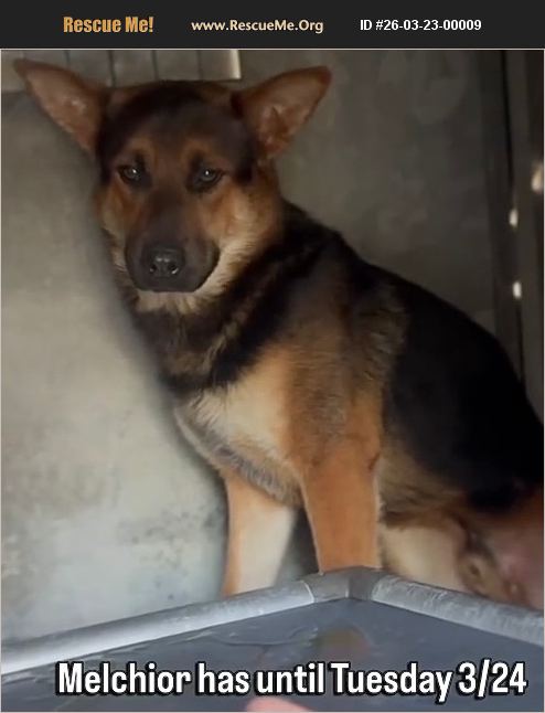 Urgent!!! This sweet scared pup will be killed on 3/25 because of severe FAS (fear anxiety stress) in the shelter environment!!! Please save MELCHIOR!!! Video: https://fb.watch/G0wEyjU2Nn/?mibextid=wwXIfr&fs=e MELCHIOR, A2254037 - NEUTERED MALE, BLACK AND BROWN GERMAN SHEPHERD. Shelter: NORTH CENTRAL Age: 1 YR, 2 MOS Weight: 47 LBS Scheduled Euthanasia Date: 03/25/2026. This animal has been at the shelter since 01/31/2026 and on this list since 03/19/2026. Reason for euthanasia: High FAS (fear anxiety stress). Declining in shelter, hiding in cubby and constant barking. Last day to take animal: 03/24/26 Scheduled euthanasia date:03/25/26 Melchor is available for New Hope, adoption, or foster. NORTH