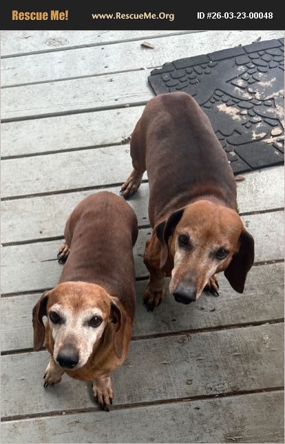 Male and Female litter mates, Miniature Dachshounds need a home due to owner requiring long term care. Currently live outside with Dog door access to a heated porch. Household includes 2 cats that are fed alongside the dogs. Pair needs to be kept together. Photos to come.