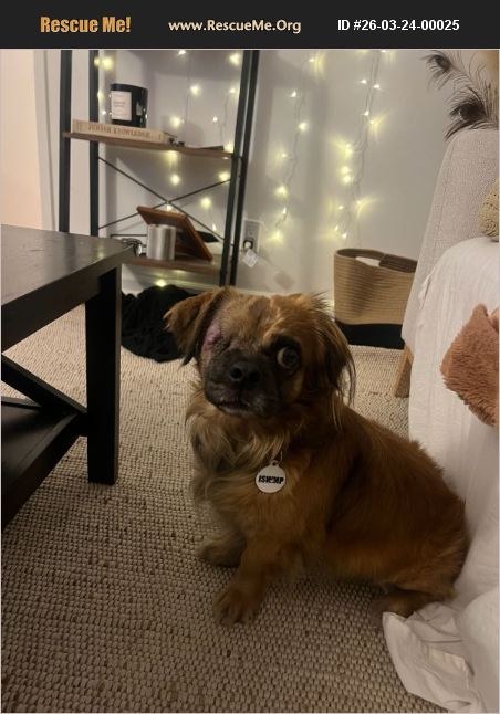 Winky is a gentle little Pekingese mix with a heart full of love and a story that makes him all the more special. After losing one eye and becoming blind in the other, Winky is bravely learning how to navigate the world again-and he's doing it with quiet resilience and a whole lot of sweetness. He's a low-energy companion who would much rather be curled up in your arms than running laps around the yard. In fact, cuddling is his absolute favorite activity-he truly lives for being close to his person. Winky can be a little shy when meeting new people but with a bit of patience and a gentle approach, he warms up and settles in. Given his blindness, he just needs a little extra time to feel safe and understand his surroundings. On walks, he's incredibly easy to handle-he takes things nice and slow, stopping to sniff and take in the world at his own pace. While Winky does well passing other dogs on walks and is generally unbothered by them outside, he will probably do best as the only dog in the household. Winky would thrive in a calm, patient home where he can continue to adjust and build trust. In return, he'll give you endless affection, quiet companionship, and the kind of bond that only a truly special dog can offer. If you're looking for a loving, low-key cuddle buddy who just wants to be close to you, Winky might be your perfect match
