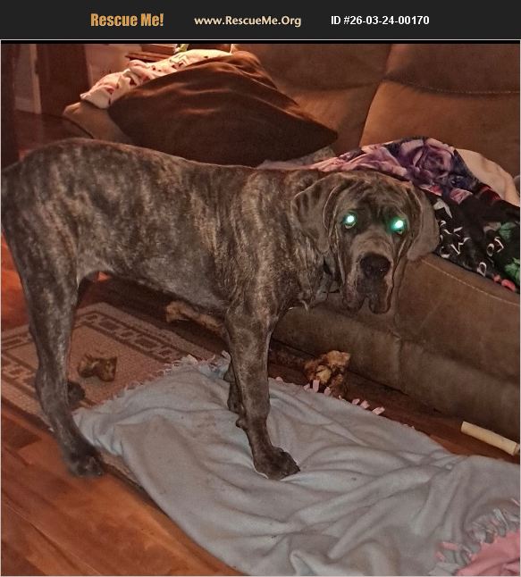 Hate to do this but we have to rehome our boy Duke he is 11 month old Daniff great with kids other dogs, and cats. My wife and I work to much and he's to much for my mother in law to take care of he is fully update on shots will need one year shots in April he is still intact zero food aggression does need working with on jumping and counting surfing fully house broke and not kennel trained does not have papers asking 400 for rehome fee just want him to go to a good home