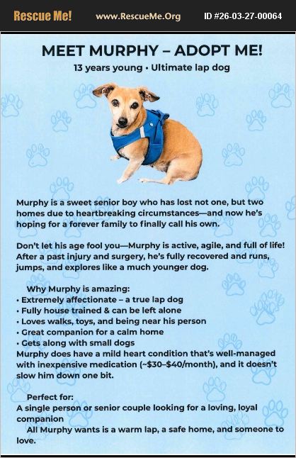 Murphy Senior Chiweenie Adoption fee $350 Please complete an adoption application at https://form.jotform.com/202126352339045 Applications are evaluated in the order received. Adoption fees help fund the ever increasing veterinary and daily care of our other animals in need. *IF adoption fee includes spay and neuter- cryptorchid surgery is not included.