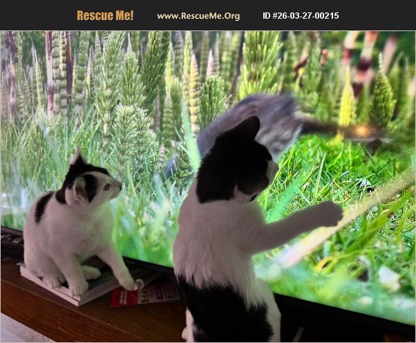 Inkspot is a playful kitten, very affectionate, and plays well with others. Bonded with Rorschach, his brother from the same litter. Favorite game besides cat wrestling is leaping for a toy bird on a fishing pole.