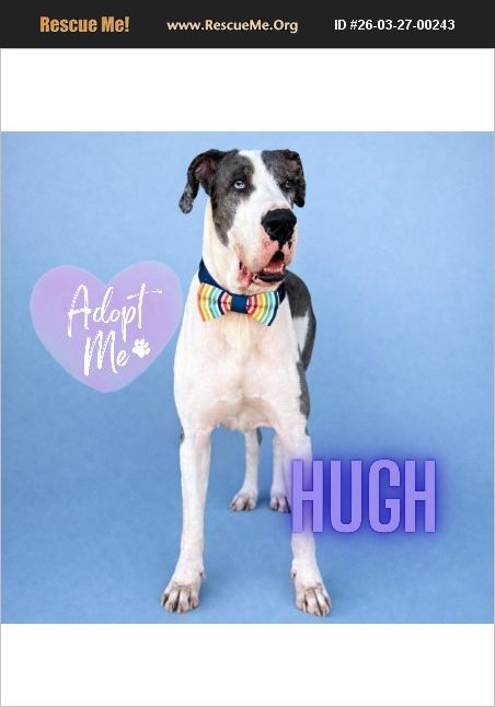 PLEASE NOTE: HEARTY PAWS IS COLLABORATING WITH PIP'S RESCUE PACK. PLEASE SEE BELOW FOR INFORMATION. Hugh is a 3-year-old, 120 lb Great Dane who narrowly escaped the euthanasia list at the San Antonio shelter. Today he's safe in foster care in Pflugerville, TX, where his sweet, goofy personality is shining through more each day. Once Hugh feels comfortable, he's an affectionate boy who loves being close to his people-often showing his love with his signature full-body Dane hugs. Hugh has been working with a fantastic trainer, and we've learned that he's simply a very anxious guy who does best with calm, compassionate handling and a predictable environment. When his world is structured around helping him feel safe, he truly thrives-as we're seeing every day in his foster home. We also want to be transparent that Hugh was previously adopted, but it ultimately wasn't the right fit. Because of this, we're committed to finding a home that will truly set him up for long-term success. Hugh's Ideal Home: Calm, low-traffic household 1-2 adults maximum No children Patient adopters who will respect his space and allow him to decompress A home committed to continuing his compassionate, low-stress approach The Good Stuff About Hugh: Gentle, goofy Great Dane personality Extremely affectionate once he trusts you Loves leaning in for giant Dane hugs Forms strong bonds with his people Thriving in foster with the right structure and environment Hugh tends to gravitate toward women, but he currently lives with a tall male in his foster home and adores him, proving that calm energy and patience go a long way with this big guy. Hugh has been through a lot in his short life, and now he just needs a peaceful home where he can finally relax and be loved for the wonderful dog he is. Available through Pip's Rescue Pack Austin area (Pflugerville, TX) - transport may be considered for the perfect home Petfinder: https://www.petfinder.com/dog/hugh-84fe3628-0553-401f-86e8-b1361feb35ae/tx/pflugerville/pips-rescue-pack-ca3367/details/ Apply to adopt: https://new.shelterluv.com/matchme/adopt/PRP/Dog