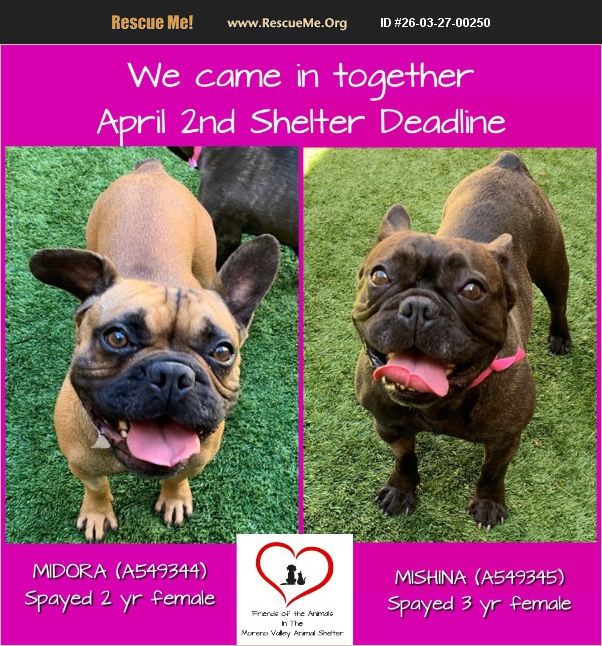 Midora and Mishina urgently need placement as they are not doing well in the shelter. They have many positive qualities, did well on a temperament test with a male dog, appear potty trained and walk well on a leash. Sadly, they are developing shelter behaviors that are affecting their adoptability. They need an experienced adopter or rescue. Watch their video to see their cute personalities outside of their kennels. Both are spayed and ready to exit! Midora is 2 years old, about 30 lbs. and Mishina is 3 years old, about 29 lbs. Save them before their April 2nd deadline!