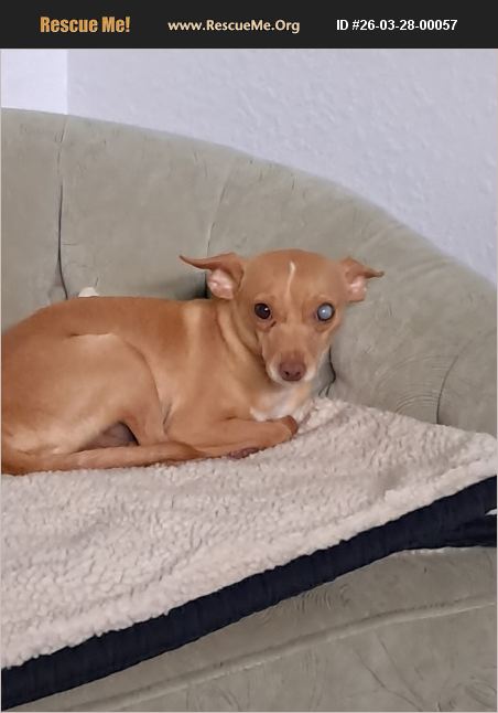 Ginger is a small, tan, female, 5-6 year old chihuahua who weighs 7lbs. She came to our rescue as a stray who had an old eye injury that could not be repaired. It looks like a cataract because it's cloudy, but it is not painful and requires no eye meds. This little girl will quickly steal your heart. She is a bit shy at first, but once she warms up, her personality blossoms. Her foster mom would love to give you all the details. This little girl is incredible. There are no woods on how precious Ginger is. Totally vetted and ready for her forever home. Adoption fee $400