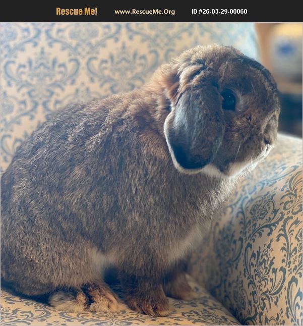 This is a mini loop named Cutie. He is the sweetest bunny that ever lived. We have had this bunny for 5 years. Due to my son's allergies he is unable to free roam in the house like he is used to. I don't think it's fair he lives in his cage and would need a home where can be free. He truly is the sweetest bunny and so calm.