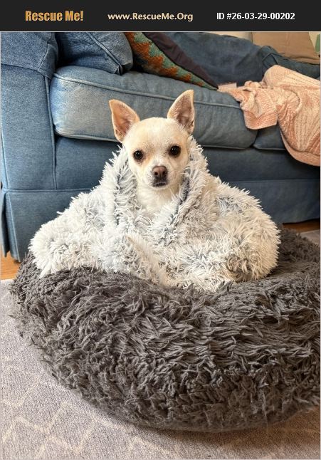 Elfie is an adorable 4 -year-old chihuahua that weighs 9 lbs. She is very sweet and good with other dogs. Her current owners can no longer care for her and need to re-home. She would be best suited in a quiet home without young children. Elfie is up to date on vaccines, spayed and house trained. If you are interested in her, please go to our website: www.amrdog.org and complete the application. LOCAL AREA ADOPTION ONLY