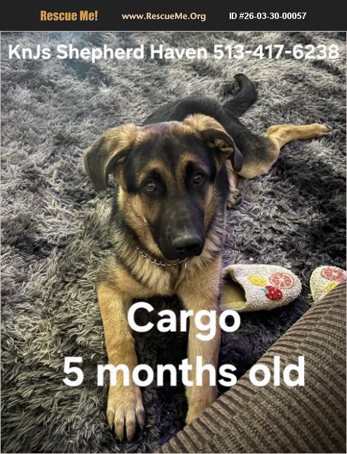 APPLY HERE: TO ADOPT, APPLY HERE: https://docs.google.com/forms/d/e/1FAIpQLSftfJ3aixd0OY8rysxPW0DL1p-swDSrE3k7E8tt_pu7dM2xHQ/viewform?usp=header�%81%A0 CONTACT ME: 513-417-6238 or EMAIL: [email protected] ***Trying to keep this amazing breed OUT of shelters, so please HELP me by SHARING this post and/or sending to anyone that may be interested in adopting. IT TAKES A VILLAGE, AND YOU ARE MINE. Those of you that rescue/adopt these Shepherds in need instead of paying a Breeder, YOU are the REAL TRUE HEROES.***Thank you so much. DISCLAIMER: Every effort is made to provide the most accurate representation of each shepherd. While I disclose all information provided to me, KnJs Shepherd Haven cannot guarantee the completeness of a Shepherd's prior history. I provide all known details in good faith to ensure a successful match. [Case opened on 3/27/26]. URGENT!!! Dayton, OH (willing to drive up to 2 hours). 5 MONTHS OLD MALE GSD (DOB: 9/9/25). His name is 'Cargo'. Background: Has been with Current Shepherd Parent since he was weaned from a friend. NOT UTD on shots WITHOUT record (has NOT had a vet visit yet-needs ASAP). NOT Fixed. Good with kids. Good with dogs. Good with cats. House trained (may have occasional excited pee-common puppy behavior). Crate trained. Any known medical issues?: None known. Abuse/Neglect/Trauma History?: None known. ENERGY LEVEL: High. PREY DRIVE LEVEL: Low. Weighs 55 lbs. Currently on Rachael Ray Nutrish food. Good with car rides?: Okay-whines and does not like when the window is down. Socialized with: *people?: Yes. *dogs?: Yes. Good with meeting new people? (ALWAYS USE PROPER INTRODUCTION!): Yes, but will jump from excitement. Loves: Blue Buffalo Health Bars, his mini German Shepherd stuffy, squeaky toys, bones, baseballs, slippers, chew toys, chew bones, cuddling, walks, chilling on the couch, playing with kids, playing with dogs, balls, fetch, being near his person. *Intelligent and knows Basic Commands?: This breed is super intelligent. *Good Recall? (ALWAYS RETRAIN BEFORE ALLOWING OFF LEASH): Unknown. *Good on a Leash?: Yes. *Lovable?: This breed is super lovable once they claim you as their person/family. *Eager and fast learner?: This breed is super fast learners when they are being committed to and worked with. Bite History?: NO. He is in the GSD Puppy Phase where he is PLAY nipping. NOTES FROM CURRENT SHEPHERD PARENT: '�ٴ� please love and cuddle him as much as you can! He is truly a GREAT dog and with some training has the potential to be an amazing protector and overall a great addition to your family! I am teary eyed as I write this because we truly love him but I will be happy knowing he may provide a comfort to someone who may need it more than this mama bear and her sometimes chaotic house lol' Re Homing because�'�|: Cargo is in a home with five young children and his puppy behaviors (play nipping at ankles, jumping to play) have become overwhelming. This is very normal puppy behavior for the breed, and he simply needs someone with the time to properly work with him and teach him manners and redirection of his nipping. He will be a great companion for the right person. Will thrive best�'�|?: In a loving, structured home with someone who is home often and committed to working with him. He needs guidance, consistency, and an outlet for his high energy. A fenced yard is ideal (currently kept on a leash outside due to no fence). With the right person, Cargo will grow into an incredible, loyal companion. Comes with: Collar, food, and toys. RehomingFee $250 . If not on Facebook, please text me for more pics and full Profile. Serious Inquiries, please APPLY HERE: https://docs.google.com/forms/d/e/1FAIpQLSftfJ3aixd0OY8rysxPW0DL1p-swDSrE3k7E8tt_pu7dM2xHQ/viewform?usp=header�%81%A0 Thank you. Would you like to donate to a great cause? Any help is so much APPRECIATED and NEEDED. (We are NOT 501c) Help US to help THEM��%A4%8D Tysm. #ItTakesAVillage LINKS TO DONATE: Amazon WishList: https://www.amazon.com/hz/wishlist/ls/1D1I1QOVAGR4H?ref_=wl_share�%81%A0 Walmart WishList: https://www.walmart.com/lists/shared/WL/6214b31a-4919-4d0a-868e-b75e6bace5e0�%81%A0 Venmo: https://venmo.com/code?user_id=2889571939385344656&created=1767974792�%81%A0 CashApp: https://cash.app/$KnJsShepherdHaven�%81%A0 PayPal: Keren Lainhart [email protected] 513-417-6238 KnJs Shepherd Haven 513-417-6238 [email protected] Text/Call: 513-417-6238. Please JOIN OUR GROUP: Go to the ALBUM 'Current Shepherds Needing Rehomed' and it will show all of the Shepherds that we are trying to find great homes for. Please message me if you are interested in any of them. Thank you https://www.facebook.com/groups/593859788742255/?ref=share�%81%A0