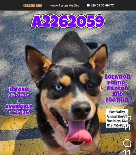 Urgent!!! This scared, 12 month old, boy along with another dog, were dumped in the woods & it took several days to catch them. No animal deserved what was done to them!! Now at East Valley Shelter, but so scared of the environment that now they have been put on the urgent list and if not adopted quickly, they will end up on the euthanasia list!!! Video: https://www.facebook.com/reel/920056657297749/?fs=e&mibextid=wwXIfr&fs=e GARFUNKEL, A2262059 - MALE, HUSKY/GERM SHEPHERD. Shelter: EAST VALLEY Age: 1 YEAR 6 MONTHS. I weigh approximately 55.00 lbs. This animal has been at the shelter since 03/20/2026 and on this list since 03/28/2026. Urgent Listing Reason: Severe FAS (fear anxiety stress)