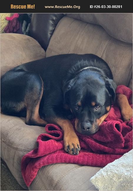 Spayed female Rottweiler. She'll be 4 in August. Rehoming due to ill health. Inside dog, completely housebroken. And crate trained. Has some ACL PAIN. IFshe runs a lot she needs a baby aspirin, about 5 or six times a year. Needs fenced yard. She will chase cars. Too boisterous for small kids. No papers
