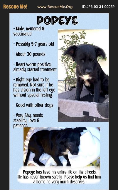 Amanda Lippman ([email protected]) 10:03�'��AM (1 minute ago) to me Popeye deserves his spot to live his best life. We won't let him down URGENT: FOSTER OR ADOPTER NEEDED FOR POPEYE Popeye was found on the streets of Miami with an electric cord tied around his neck. No dog should ever endure that kind of cruelty�'�| yet here he is, still fighting and still so deserving of love. He is very shy and timid, but gentle. Having limited vision he has shown how resilient he is. Popeye gets along well with other dogs and even cats. He just needs a safe, patient environment where he can finally feel secure and start to trust. ��%8F�This sweet 5-6 year old 30 lb angelic boy has spent his entire life surviving, not living. He deserves to know what it feels like to be safe, warm, and loved. �٪%8F We are urgently looking for: �'ۢ A committed foster who can give him stability and patience. We will cover food and vet bills for a foster home. He's doing great on his heartworm treatment and it's already paid for as well. Please, if you can help-or know someone who can-reach out. Even sharing this post could be the reason Popeye gets his second chance. Let's come together and change his story.