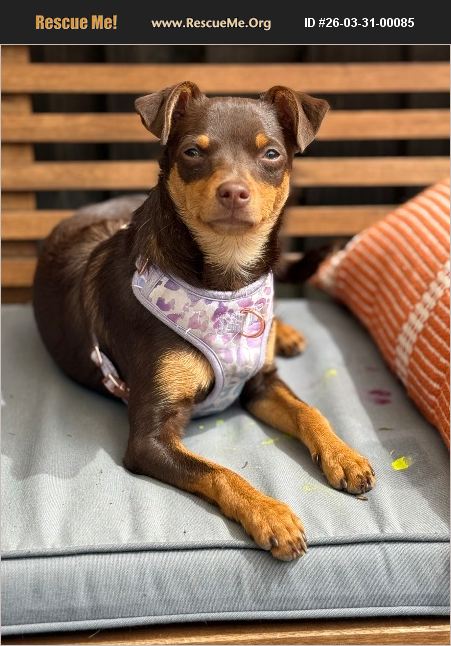 Sienna is a Chihuahua, Miniature Poodle, Russel Terrier, Miniature Pinscher mix, weighing in at 11lbs. She is approximately 6 months old. She's a smart, playful, and affectionate puppy who loves going on walks, runs, and hikes. She also enjoys chew treats and learning tricks. She is fine to be left alone. She is potty trained and crate trained, and knows basic commands like sit, lie down, and leave it. She can be a bit anxious and reactive at times (barking at new people or situations), and she would benefit from a calmer home where she can build confidence. She also has a strong prey drive, so she would do best in a home without cats or small animals. Because of her energy and sensitivity, we think she would thrive in a home with older children or adults who can provide consistent training and guidance.