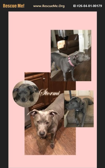 Stormi is a 2 �%BD Blue Nose Staffordshire Bull Terrier. She was my sister's dog. My sister passed away. I am disabled and have two dogs of my own. She is a loving ball of energy that gives hugs and kisses. She loves everyone and never met a stranger. She loves a lot of attention and would most likely be better as the only dog. She's looking for a warm loving forever home. So she can have her well deserved happy ending.