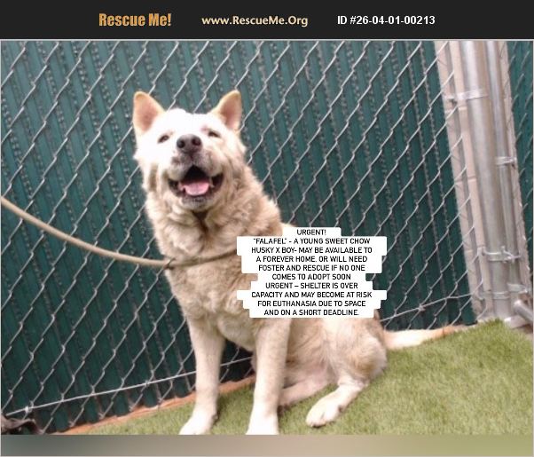 Courtesy Posting: DOWNEY, CA (S CAL)- LOS ANGELES COUNTY ANIMAL CONTROL- DOWNEY- ID #A5765584 'FALAFEL' - A YOUNG SWEET CHOW HUSKY X BOY- MAY BE AVAILABLE TO A FOREVER HOME, OR WILL NEED FOSTER AND RESCUE IF NO ONE COMES TO ADOPT SOON URGENT - SHELTER IS OVER CAPACITY and may become at risk for euthanasia due to space and on a short deadline. Please help us find a loving and forever home, or foster and rescue to save this beautiful boy who is said to be 2 years young and 60 lbs. The shelter told us Falafel: 'presented as quiet and somewhat hesitant during intake, showing a crouched, tense posture with reluctance to approach but no signs of aggression. He avoided eye contact and remained subdued, though he readily accepted canned food, suggesting some willingness to engage. He arrived with a muzzle in place but maintained a low fear-anxiety-stress level overall. Medically, he is bright, alert, and responsive with stable vital signs. Notable findings include several itchy skin lesions, including hotspots on the ventral neck, lower lip, and left lateral pelvis, with two testing positive under Woods lamp. Mild alopecia around the nose and mouth was observed but appears healed. He has been started on routine vaccinations and parasite prevention, with follow-up care recommended to monitor and treat his skin conditions. He is on a chip hold we are looking at his available date to be around 4-7-28.' Falafel has been vaccinated and is already neutered as well. We are hoping the shelter will make him available to adopt after this time, but he may become Rescue only due to medical or being shy. If adoptable, and to give Falafel a forever home, please contact the shelter directly to adopt by calling 562-940-6898 asap and reference his applicable ID. His listing link is : https://animalcare.lacounty.gov/dacc-details/?animalId=a5765584 If made Rescue only and you are interested just to foster, or adopt through a rescue, or if you need further help, please contact [email protected] or Southern California Chow Chow Rescue Network asap as we are trying to find fosters we can then refer to a rescue group to save. Rescue groups should email us and the shelter at [email protected] . We will be posting additional information updates, pictures and video as we receive such on facebook at: https://www.facebook.com/783968124/posts/10168777615793125/?mibextid=wwXIfr Note: to view contents of links you will need to copy and paste each one separately into your browser.