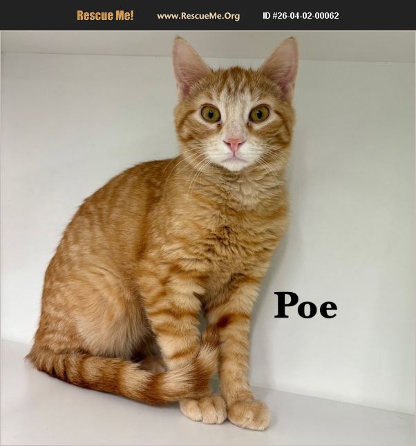 Meet Poe Like his namesake, Edgar Allan Poe, this charming 4-month-old orange tabby has a mysterious side at first. When you first meet Poe, he may be a little shy, quietly observing the room like a thoughtful little poet. But give him a little time and kindness, and you'll discover there's nothing gloomy about this sweet boy. Once he feels safe, Poe transforms into a playful and affectionate kitten who loves to chase toys, pounce dramatically, and then curl up beside you for cozy snuggles. His gentle nature and loving heart make him the perfect companion for anyone who appreciates a kitten with a little depth and a lot of sweetness. All he needs now is a forever home where his story can truly begin. If you are interested in meeting Poe please go to our website at www.rescueridge.com and complete an application.