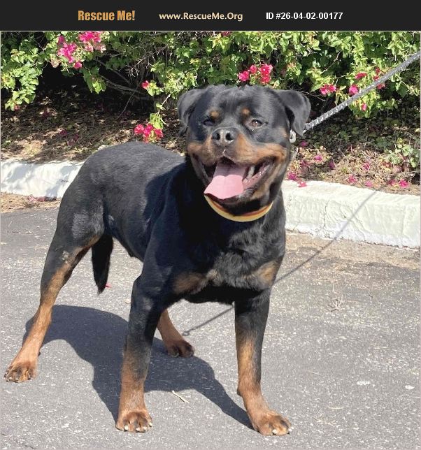 Axel is a handsome jumbo dude with a nice personality, probably not quite 2 years old. Axel appears to be purebred and he does have a natural tail, but we have no way of knowing if he is mixed with other breeds. He will need a new home off base because Rotties are not allowed to live on Camp Pendleton Marine Corps Base. He walks well on leash. Axel will 'sit' for a treat and he has a gentle mouth when taking the treats from you. He loves, loves, loves to play fetch and will bring the ball back to you so you can throw it again and again. He came to us at the shelter wearing a harness embroidered with 'Best Friend' so he's been somebody's best buddy! We are not sure yet how he is with other dogs, but we will check that out soon. You can always call for more updated info and/or to make an appointment to meet him and spend time in the play yard getting acquainted. He is, of course, a really big boy and will eat a lot, so consider your budget if planning to adopt any big dog. If you think bigger is better, and if your family is big-dog savvy, and you know and love the breed, then maybe he's a match for you. Want to meet him? Give us a call and we will set up a meet-and-greet. He'd like to play ball with you! The public is welcome to come adopt the patriotic pets at the Camp Pendleton Animal Shelter! Even if you don't have normal, regular access to the base, please DO give us a call and we will work with you to set up a meeting. (Sort of a 'concierge service.') 760-725-8120 All dogs are spayed/neutered, vaccinated, dewormed, flea-treated, and micro-chipped prior to adoption. Call ahead to schedule a meet-and greet! Adoption Fee: $50. Camp Pendleton Animal Shelter: Open Wed - Sat, 10:00 - 3:30, Closed on federal holidays.