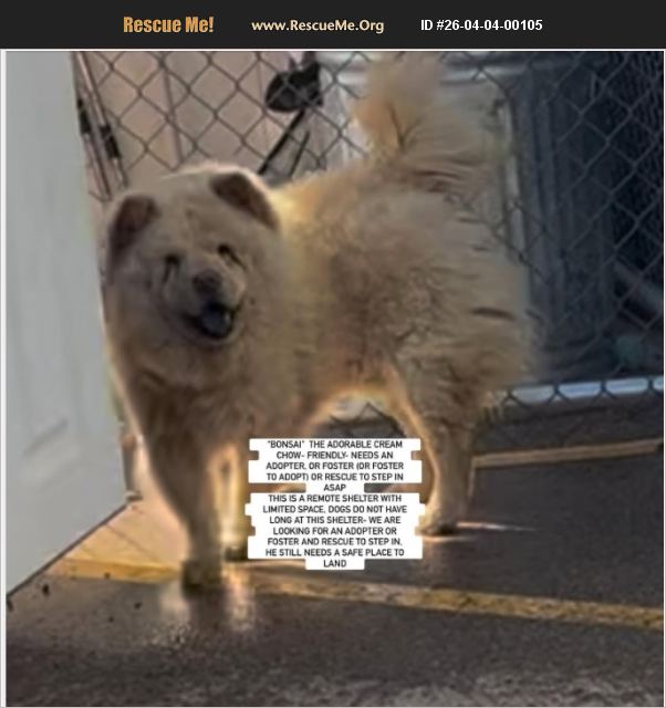 Courtesy Posting: Nr ALBUQUERQUE, NEW MEXICO -'BONSAI' the ADORABLE CREAM CHOW- SANDOVAL COUNTY ANIMAL SERVICES- FRIENDLY- NEEDS AN ADOPTER, OR FOSTER (OR FOSTER TO ADOPT) OR RESCUE TO STEP IN ASAP THIS IS A REMOTE SHELTER WITH LIMITED SPACE, DOGS DO NOT HAVE LONG AT THIS SHELTER- WE ARE LOOKING FOR AN ADOPTER OR FOSTER AND RESCUE TO STEP IN, HE STILL NEEDS A SAFE PLACE TO LAND. HELP PLEASE! Help! The shelter reached out to us asking for help for this adorable boy who is estimated to be 5 years old and with no noted medical issues at this time. Bonsai was found as a stray, but his owner sadly never showed. The shelter described him as a 'sweet chow' and let us know he came to their small shelter on 3/27 after a Good Samaritan found him and brought him in their car after a day or two of gaining his trust. The shelter also provided good video of him being very calm around a very active puppy and said 'He has shown no other forms of aggression towards staff or animals. Bonsai will receive vaccinations, microchips and his neuter through us. We do not have a veterinarian onsite so the neutering aspect may take us a couple of weeks to get an appointment. Bonsai is very aloof thus far with staff and other canines.' They sent us several videos, one with the you, and another with staff he ignored as in typical chow fashion. We are now desperately looking for a good home, or a foster and a rescue (rescue groups need fosters). The shelter told us they will consider adoptions to qualified homes. For adoption, foster or rescue inquiries for, please contact [email protected] asap or Southern California Chow Chow Rescue Network and we can connect parties with serious interest to the shelter, or a willing rescue group. Most rescues need a solid foster to save him. We will also be posting updates, additional pictures and videos on facebook at: https://www.facebook.com/783968124/posts/10168786287808125/?mibextid=wwXIfr Note: to view contents of link you will need to copy and paste it into your browser.