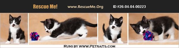 Rumi is a black and white tuxedo kitten who was born February 9th, his brothers are Bobby an orange tabby, Saja and Jinu, who are all black domestic short hairs, and Mira, a sister who is a female tortoiseshell kitten. They are healthy, dewormed, up-to-date on age appropriate vaccinations and will be neutered, spayed and microchipped the third week of April. They are almost ready for their new family and a lifetime of love. They are well-behaved in the home, use their litter box and are eating well. To meet and possibly adopt Momma Celine or any of her babies, preferably in pairs unless you have another feline at home, please fill out an adoption application https://friendsofpetraits.com/cat-adoption-application/ After the application is complete, please contact [email protected] to schedule an appointment to meet them. As a pair, their adoption fee of $300 benefits the Friends of Petraits Rescue. They are being fostered in Chicago's Rogers Park neighborhood.