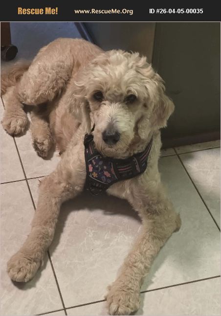 Adopt Cora! 4 years old 49 pound female Goldendoodle Fence preferred Cora has soft blonde white fur, soulful eyes and a ready smile. She is a good eater and is working to add a few pounds to her slender frame. Cora does well with the resident pups but prefers people and would do best in a home where she is not left alone for long periods. She is not rambunctious but has perfected the standing hug so little children may not be ideal. She walks well on a leash and in the car, but is still very jumpy so a fence is preferred. If you are looking for puppy cuddles or a walking partner Cora may be the loyal companion to complete your family. To apply please submit an application and a $20 application fee at freedomtailsohio.com
