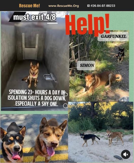 The cruelty and betrayal never ends. These two beautiful pups only one year old were found abandoned in the woods with mountain lions and coyotes. They were rescued by good Samaritans and taken to the East Valley Animal Shelter where they are now scheduled to be euthanized on 4-9-26!!! Video: https://m.facebook.com/groups/841456119278642/permalink/26372649645732605/?mibextid=wwXIfr Video: https://fb.watch/Gld8RI5tKO/?mibextid=wwXIfr&fs=e they have finally learned to gain a little trust, but are still very shy. Please reach out to The East Valley, Animal Shelter or Better go there and adopt them. Their only fault is being shy. They have no bite history. You can Adopt or Rescue one or both. East Valley Animal Shelter 14409 Vanowen St., Van Nuys, CA 818-756-9325 they look to be Shepherd husky mixes Simon A2262057 Garfunkel A2262059 Goldie 213-264-8988 Lucy 213-655-7613 Veronica 213-435-9152 EV shelter at 818-756-9325