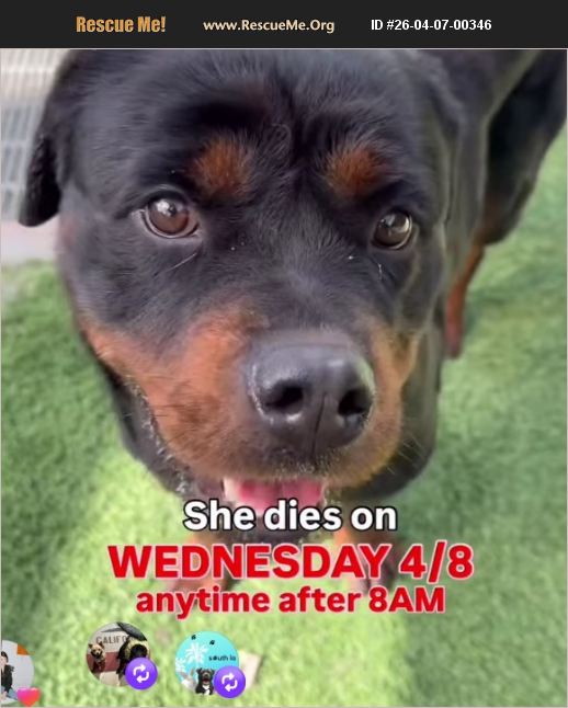 Coco is a sweet love bug of a Rottie and is in immediate danger at South Los Angeles Animal Services. This 2 year old Rottie is looking or a a home and does not deserve to die. Please act fast. Contact Annette at 3238989239