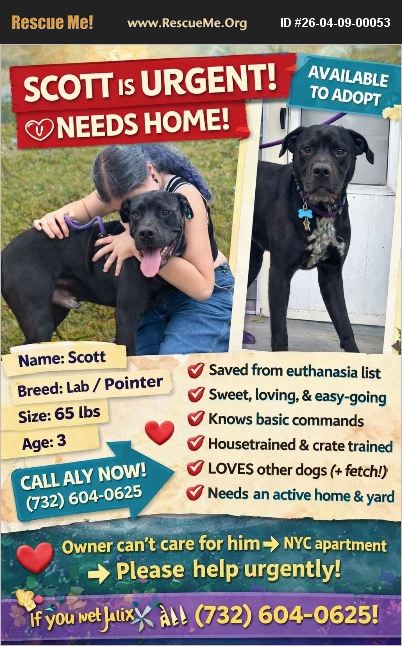 A+++ PUP here . This gorgeous lab/pointer mix Scott was saved from the euthanasia list in an overcrowded southern shelter. As a black dog, he was lucky enough to escape the shelter and thought he had won the lottery when he landed in his current home. However, his adoptive mom is an older lady in a NYC apartment and after a recent fall, she has had to face the reality that this 3 y/o, 65 lb. boy is just a little too big and too strong for her to manage. Scott is super sweet and affectionate, easy-going, knows his basic commands, is housebroken, crate/trained, and loves other dogs (he's a dog park rock-star!). And, just as you would expect from a lab, he loves to play fetch and brings the ball back to you for you to throw again. Scott really needs a home with one (or more) dogs for him to play with, preferably a nice yard to run around in, and an active family that will enjoy playing with him. His situation is urgent because his current mom is unable to walk him and living in a city environment, she has no choice but it is a tremendous struggle for her every day. She loves him tremendously and wants to make sure that the next family he goes to will be the one that loves him forever. Scott will make a wonderful addition to any home! ***** If you are interested in learning more about this boy and seeing additional photos and videos, please text Kat 516 457-3678 Thank you for caring about a pet in need! Name: Scott is URGENT! Breed: Lab / Pointer Size: 65 lbs Age: 3