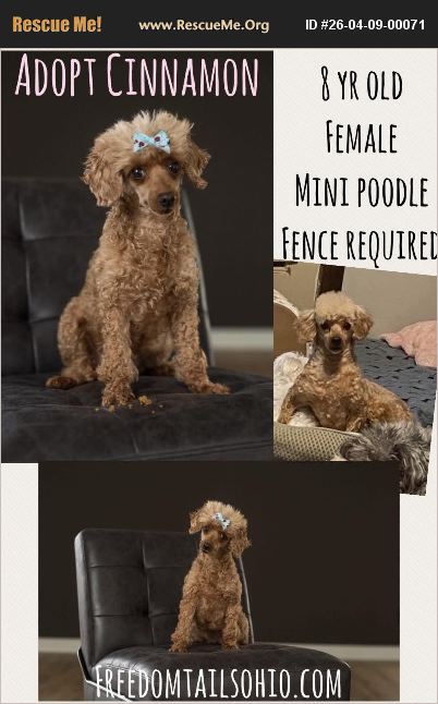 Adopt Cinnamon Mini Poodle 8yrs, F, 16 pounds Fully vetted/vaccinated/micro-chipped fence required Fostered in Columbus Cinnamon is bright and curious. She seems to learn quickly and is working on leash walking and house-training. She knows what to do when she gets to the grass! She has been sleeping quietly all night in the shared bed space with foster sibs. She loves the other pups in the house and they are showing her how to be a family pet. She would thrive in a calm environment with patient humans who understand that rescue dogs bloom at their own pace. She is extremely dog-friendly and could happily coexist with another mellow, friendly dog. What she wants most is a home where she can be loved-and give back twice as much in return. To apply submit your application at freedomtailsohio.com