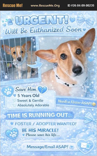 WHERE ARE ALL MY CORGI LOVERS PLEASE HELP! This post is going out with a prayer Because this sweet boy doesn't have time left. Look at him those ears those eyes. A life depending on someone-anyone-to say YES. SPARKY - 5 YEARS OLD WILL BE EUTHANIZED SOON There is a rescue that wants to save him but cant without a placement . Needs a FOSTER or ADOPTER. He wasn't always this scared. In a home, with people he trusted, he was affectionate, playful, and content. But the shelter is loud, overwhelming, and it's shutting him down. About Sparky: House trained , Knows 'sit' Loves his toys Thrives in a calm, quiet environment Important to know (please read): Needs an adult-only, experienced home Has shown resource guarding with food and toys that escalated into Sparky biting , last bite was over a year ago. Needs structure, patience, and time to build trust . Best as the only pet in the home This is NOT a bad dog. This is a dog who never got the guidance he needed and is now overwhelmed and scared. In the right home with the right person he has every chance to become that sweet, loyal companion again. PLEASE don't let this be how his story ends Rescue can step in he just needs a place to go . He will be euthanized without help . Be the one who sees past the fear. Be the one who gives him a chance. Be his miracle. The rescue will provide a trainer to assist . MESSAGE ASAP TO SAVE SPARKY, text Kat 516 457-3678 if you can help foster or adopt . Run to the Rescue Where Love and Peace Will Follow.