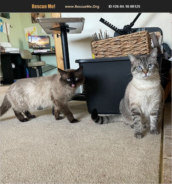Hi I have two Siamese mixes I am looking to rehome both fixed and current on shots. One male Angel and he is almost 5 and Oni is 6 and female.