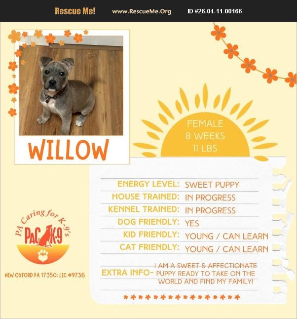 Dog is coming soon. More information and area fostered will be posted once they are available. All dogs are kept up to date on vaccines and preventatives while in foster care. New Oxford PA 17350; LIC #9736�'�� We are PA Caring for K-9's, an all-breed dog rescue that is solely run by volunteers. Most of our dogs are rescued from high kill shelters in the South. If the dog is posted, they are still available! Once arriving, these dogs enter foster homes, as we do not have a shelter. We cannot adopt out dogs to a home with dogs that are not fixed or up to date on shots. If interested in adopting, please submit an application online at www.pack9rescue.org. Our adoption fee for altered dogs is $350 and goes directly to saving the lives of more dogs. Our adoption fee for unaltered puppies will be $400 which includes a refundable $50 deposit upon receipt of spay/neuter certificate. Learn more about adopting from us or volunteering for us at www.pack9rescue.org or check us out on Facebook for more information and a complete list of dogs available for adoption. https://www.facebook.com/PaCaringForK9s/ See upcoming events below where PA Caring for K9's will be with some of our adoptable dogs! Saturday, April 18, 2026 10am-1pm Ciocca Honda of Harrisburg (8001 Allentown Blvd Harrisburg, PA) Saturday, May 16, 2026 10am-1pm Tractor Supply Co. Harrisburg (7150 Allentown Blvd Harrisburg, PA) Sunday, June 14, 2026 11am-3pm That Fish Place That Pet Place (237 Centerville Rd Lancaster, PA) Please check our Facebook page closer to each event as we will update daily with dogs who will be attending. All are invited to meet our dogs, but only pre-approved adopters with all household humans and dogs present will be able to adopt at the event. Apply today at https://www.pack9rescue.org/applications/ to become pre-approved.
