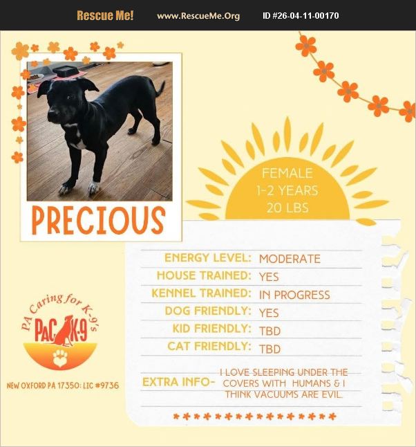 Dog is coming soon. More information and area fostered will be posted once they are available. All dogs are kept up to date on vaccines and preventatives while in foster care. New Oxford PA 17350; LIC #9736�'�� We are PA Caring for K-9's, an all-breed dog rescue that is solely run by volunteers. Most of our dogs are rescued from high kill shelters in the South. If the dog is posted, they are still available! Once arriving, these dogs enter foster homes, as we do not have a shelter. We cannot adopt out dogs to a home with dogs that are not fixed or up to date on shots. If interested in adopting, please submit an application online at www.pack9rescue.org. Our adoption fee for altered dogs is $350 and goes directly to saving the lives of more dogs. Our adoption fee for unaltered puppies will be $400 which includes a refundable $50 deposit upon receipt of spay/neuter certificate. Learn more about adopting from us or volunteering for us at www.pack9rescue.org or check us out on Facebook for more information and a complete list of dogs available for adoption. https://www.facebook.com/PaCaringForK9s/ See upcoming events below where PA Caring for K9's will be with some of our adoptable dogs! Saturday, April 18, 2026 10am-1pm Ciocca Honda of Harrisburg (8001 Allentown Blvd Harrisburg, PA) Saturday, May 16, 2026 10am-1pm Tractor Supply Co. Harrisburg (7150 Allentown Blvd Harrisburg, PA) Sunday, June 14, 2026 11am-3pm That Fish Place That Pet Place (237 Centerville Rd Lancaster, PA) Please check our Facebook page closer to each event as we will update daily with dogs who will be attending. All are invited to meet our dogs, but only pre-approved adopters with all household humans and dogs present will be able to adopt at the event. Apply today at https://www.pack9rescue.org/applications/ to become pre-approved.