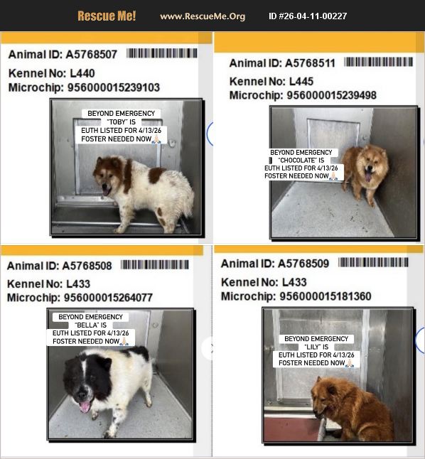 Courtesy Posting: BEYOND EMERGENCY!! 4/13 DEADLINE AT LANCASTER LA County Shelter in So Cal. 4 STUNNING YOUNG CHOWS & CHOW MIXES WILL BE EUTHANIZED ON 4/13/26. SHELTER SAYS NO EXTENSIONS WILL BE GRANTED! THEY WERE DUMPED BY OWNER RESCUE ONLY & SADLY USED CATCH POLE! Owner surrendered & says they are friendly with people they know, and other dogs! Who can foster???? Behavior assessment has NOT yet been done. WHO CAN FOSTER TO SAVE THEIR LIVES? PLEASE HELP!! WE NEED FOSTERS AND ANY AND ALL HELP TO SAVE, we are waiting on more info but seems to be a backyard breeding situation. Given up for having too many dogs! Shelter just told us, 'The owner finally called back, and they stated They are good with other dogs, they have not been around cats, they are good with kids and other people they already know. They do take time to get used to new people. Toby needs to be watched around other dogs because he is 'particular' around certain dogs.' We just received videos of all 4 dogs who seem to be shy and show zero aggression. We have pasted the dog's videos into the comments section of this post. Bella (the black and white mix ) is only one who approaches the kennel fence, but with apprehension and does bark, but with ears back, a sign of fear. The others seemed too scared or sad to come forward and were very quiet. We will be posting these videos on Facebook in the comments section of post. ID #A5768507, 2 yr old, 50 lb, male Chow X ID #A5768511, 2 yr old, 55 lb, female Chow ID #A5768508, 2 yr old, 46 lb, female Chow X ID #A5768509, 2 yr old, 49 lb, female Chow Please dm and email [email protected] if you can help. Rescues may contact the shelter directly at: [email protected] and use ID We will be posting additional photos and Videos on their Facebook page as we receive them: https://m.facebook.com/story.php?story_fbid=10168829094338125&id=783968124&mibextid=wwXIfr Note: to view contents of link you will need to copy and paste it into your browser.