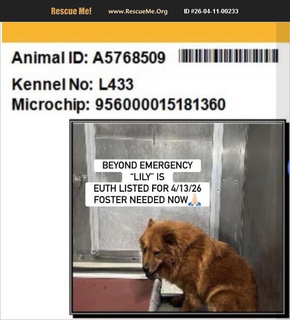 BEYOND EMERGENCY!! 4/13 DEADLINE AT LANCASTER LA County Shelter in So Ca LILY THE CHOW NEEDS A FOSTER NOW TO SAVE HER LIFE: ID #A5768509, 2 yr old, 49 lb, female Chow 4 STUNNING YOUNG CHOWS & CHOW MIXES WILL BE EUTHANIZED ON 4/13/26. SHELTER SAYS NO EXTENSIONS WILL BE GRANTED! THEY WERE DUMPED BY OWNER RESCUE ONLY & SADLY USED CATCH POLE! Owner surrendered & says they are friendly with people they know, and other dogs! Who can foster???? Behavior assessment has NOT yet been done. WHO CAN FOSTER TO SAVE THEIR LIVES? PLEASE HELP!! WE NEED FOSTERS AND ANY AND ALL HELP TO SAVE, we are waiting on more info but seems to be a backyard breeding situation. Given up for having too many dogs! Shelter just told us, 'The owner finally called back, and they stated They are good with other dogs, they have not been around cats, they are good with kids and other people they already know. They do take time to get used to new people. Toby needs to be watched around other dogs because he is 'particular' around certain dogs.' We just received videos of all 4 dogs who seem to be shy and show zero aggression. We have pasted the dog's videos into the comments section of this post. Bella (the black and white mix ) is only one who approaches the kennel fence, but with apprehension and does bark, but with ears back, a sign of fear. The others seemed too scared or sad to come forward and were very quiet. We will be posting these videos on Facebook in the comments section of post. ID #A5768507, 'Toby, 2 yr old, 50 lb, male Chow X ID #A5768511, 'Chocolate', 2 yr old, 55 lb, female Chow ID #A5768508, 'Bella', 2 yr old, 46 lb, female Chow X ID #A5768509, 'Lily', 2 yr old, 49 lb, female Chow Please dm and email [email protected] if you can help. Rescues may contact the shelter directly at: [email protected] and use ID We will be posting additional photos and Videos on their Facebook page as we receive them: https://m.facebook.com/story.php?story_fbid=10168829094338125&id=783968124&mibextid=wwXIfr NOTE: To view the link you will need to copy and paste it into your browser.