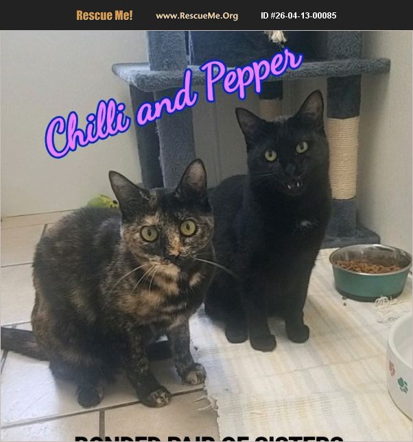 BONDED PAIR OF SISTERS. Chilli and Pepper need a quiet understanding home that will let them adjust slowly to their surroundings. They came to us as feral kittens, and they are very skiddish. MUST stay together always. Needs to be kept safely indoors, and will do best with a 'safe space' of their own.