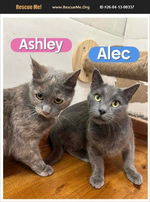 Meet Alec & Ashley Alec (2.5-year-old handsome grey boy) and Ashley (3-year-old dilute tortie beauty) are a truly special bonded pair who are looking for a forever home together. These two share an incredible connection and bring out the very best in each other. Alec with his soulful eyes, is beyond sweet and loving, adoring his people and feline friends (especially Ashley). Ashley is a gentle, affectionate girl who lives for lap time and quiet cuddles. Together, they are the perfect balance of love, comfort, and companionship. They were heartbreakingly surrendered when their previous owner lost her home and could no longer care for them. But through it all, they've had each other and their bond has only grown stronger. Alec and Ashley are both wonderful with other cats and would thrive in a home where they can be spoiled, adored, and cherished as the perfect pair they are. If you're looking to open your heart to two incredibly loving souls, this duo is ready to fill your home with double the love