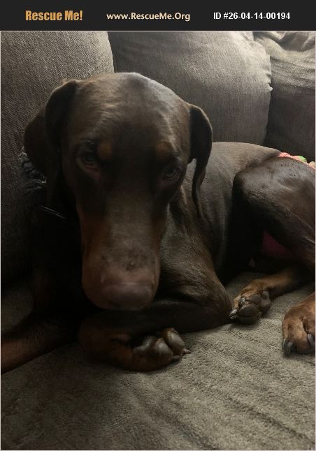 Dior needs training , to be fixed and a place to fully run. I have been sick with Cancer & have not been able to give her the life she deserves. She is only 4 years old. She does well with treats. She broke 3 cages so she does not like cages. She really needs someone who can take the time to train her, get her fixed and fenced in yard. She does not like other dogs or cats. We do not have kids so she would be best for A young couple or older couple with no kids. Please help us find a good home. Maybe your Doberman passed away? Please be honest & no breeders.