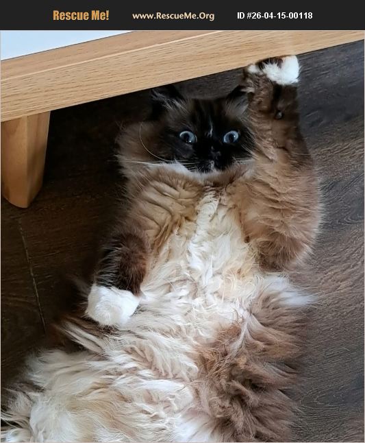 Introducing our beautiful mitted Seal Point Penny who lives in Edwardsport, Indiana. Her birthday is February 22, 2020. She enjoys being groomed and has no issues with having her nails trimmed. She loves being a lap cat, loves petting, and chin rubs-letting you massage her face a very long time! She's 'talkative for food, attention and grooming but not obnoxiously'. Penny isn't doing well with the toddler--hissing a growling at him 'despite him being gentle' in the home in addition to the other cats in the home--one of which an adolescent. She ignores the dog(s), but we feel she'd be best in a home as an only pet. Free feeding the other cats from a 'large community gravity bowl' limits the ability to help her lose weight. Her additional weight, seems to limit her to 'grooming her hind end'.
