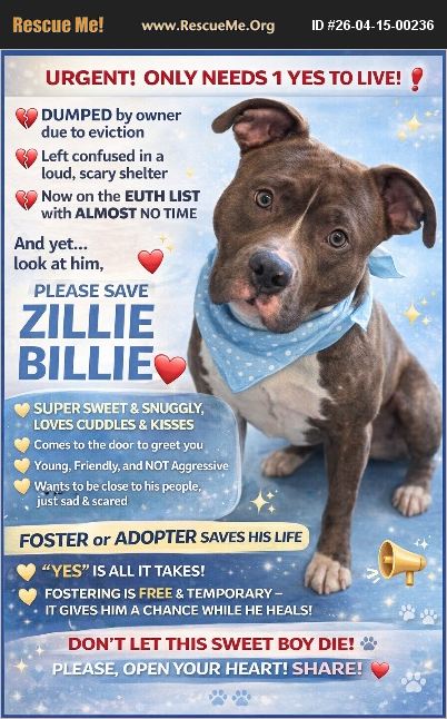 EUTH COMMAND!!! SOS!!! SAVE ZILLIE BILLIE!!! 2 YEARS OLD | 65 LBS | OUT OF TIME HE CAN BE KILLED AT ANY MOMENT - PLEASE DON'T SCROLL This post is going out with a prayer because Zillie Billie's life depends on ONE YES. Zillie Billie didn't do anything wrong.His owner was threatened with eviction and instead of safety, he was rushed into a high-kill shelter and left behind. No goodbye. No explanation.Just fear, confusion, and heartbreak. Imagine the person you loved most walking away leaving you in a loud, terrifying place full of strangers.That is what he is going through right now. When he first arrived, he completely shut down.But after just a few days he is already trying. Greets at his kennel door Comes out and seeks gentle pets Wants to be close to people Loves affection, cuddles, and kisses Volunteers adore him He is NOT aggressive or rough in any way. He's young, he's active but most of all - he just wants to love and be loved. He is not broken . He is HEARTBROKEN. The shelter gave him NO time to decompress He is already on the kill list He will die simply for being scared This is trauma - not his true personality. With a calm home, patience, and kindness he will BLOSSOM He already shows he wants connection - he just needs a chance PLEASE - GIVE HIM THAT CHANCE A FOSTER or ADOPTER saves his life.There IS a rescue ready to help. BUT THEY CANNOT PULL WITHOUT A PLACE FOR HIM TO GO. Fostering is FREE and TEMPORARY. You are just giving him a safe place until his forever home is found. And he will give you endless love in return. ZILLIE BILLIE HAS SWEET VIDEOS - you can SEE his gentle soul, please Dm for them PLEASE STEP UP TO FOSTER OR ADOPT. SHARE EVERYWHERE - BE HIS VOICE Don't let his story end like this. He hasn't given up yet ONE YES = HIS LIFE Be the one. Save Zillie Billie. If you can foster or adopt please call Kat 516 457-3678
