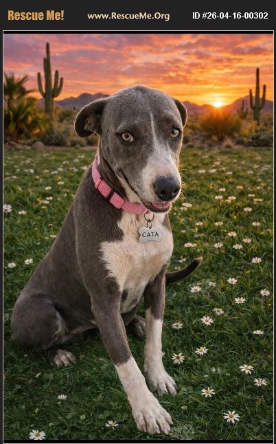 Catarina's story: Meet Cata - she is a sweet little survivor with unforgettable golden eyes. Cata is a gorgeous mixed-breed girl (43 lbs and about 2.5 years ) who looks like a mini Weimaraner. She survived the streets of Puerto Peasco/Rocky Point, Mexico, and despite everything she's been through, she has become one of the sweetest, most affectionate fosters we've ever had. I'm Cynthia. I first saw Cata last March, limping down a busy road in obvious pain. She had likely been hit by a car, and her left front leg was badly affected. Since then, she has had x-rays, a CT scan, and evaluations from four veterinarians. The consensus is clear: although her leg has neurological damage and her elbow doesn't sit quite in line, surgery isn't recommended because she functions beautifully as she is. She does limp, and she will need daily medication for life, but she lives a happy, active, high-functioning life with absolutely no loss of spirit. And what a fun spirit she has! With medical care, training and months of safety and love, Cata has blossomed. She is playful, affectionate and behaves wonderfully with our pack. She is spayed, fully vaccinated, house trained and ready to live her best life. Now she deserves one more thing: a forever family who sees how special she is. I would happily keep her myself, but with three rescues already'| well, I'd like to stay married! What I can promise is this: Cata will give you joy every single day. She will ask for snuggles, belly rubs and love and she will repay you with loyalty, gratitude and those incredible eyes looking at you like you hung the moon. I am happy to transport her to her new home and will include a month of her medication. Cata is ready for 'forever.' Are you ready for her? Please share her story far and wide. Click on the read YouTube button Below her photo to see her cute video.