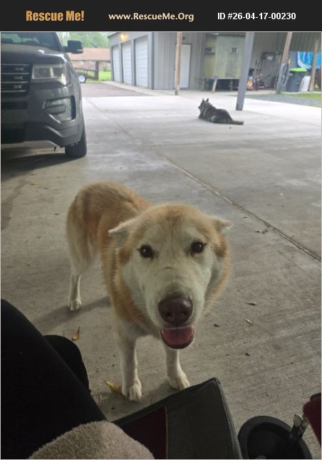 This is a red Siberian Husky that came up to my house probably under a year old he's an escape artist as most huskies are has a very sweet temperament I don't know anything about huskies I have several other dogs I cannot keep this dog if you would like to adopt it get with me he cannot stay here he would probably really like somewhere cool as we're in Texas and it's hot and he does not like coming inside